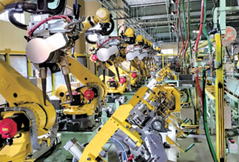 自動車のボディ、フレーム、足回り部品などの板金部品を、CO₂溶接やスポット溶接を用いた自動ラインで組み立てます。溶接ロボットによる自動化により、高品質で安定した溶接を実現しています。